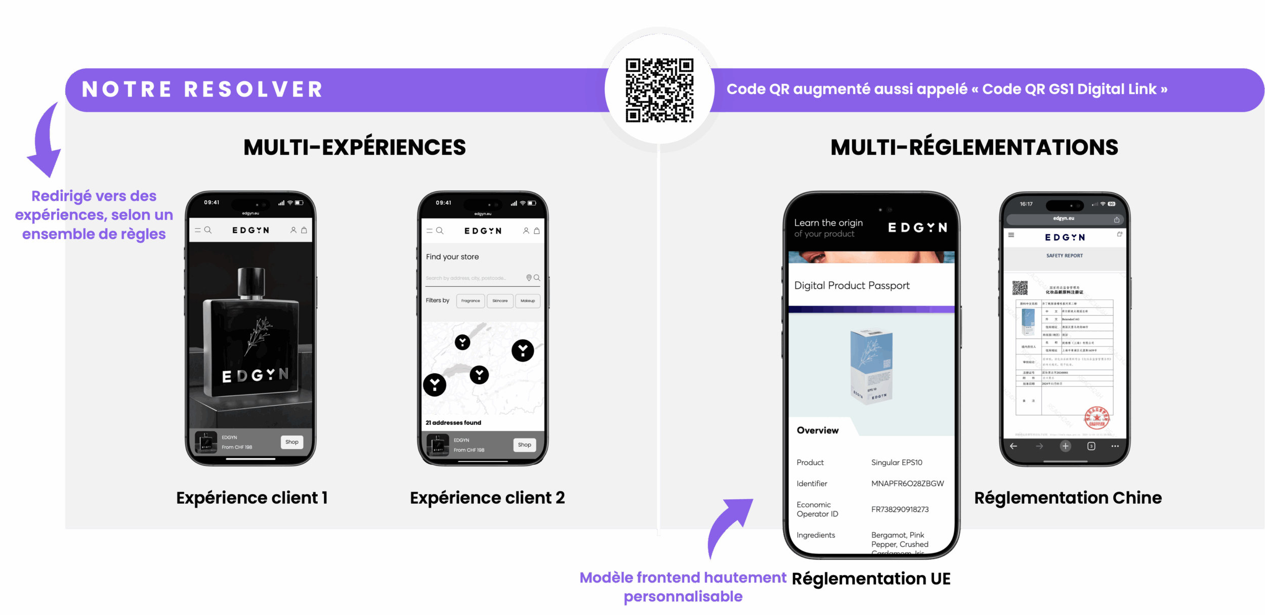 La capacité du Resolver à rediriger selon des règles permet à une marque de fournir aux différentes audiences l’information dont elles ont besoin, au moment où elles en ont besoin, et dans le format requis par la loi, tout cela à partir d’un seul scan, qui redirige l’information adaptée en fonction de la réglementation locale.